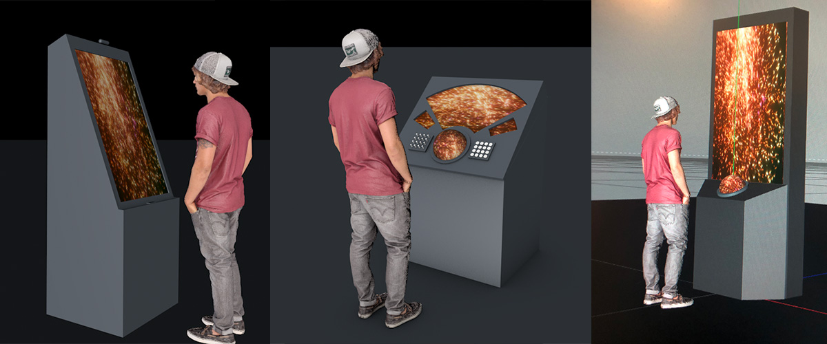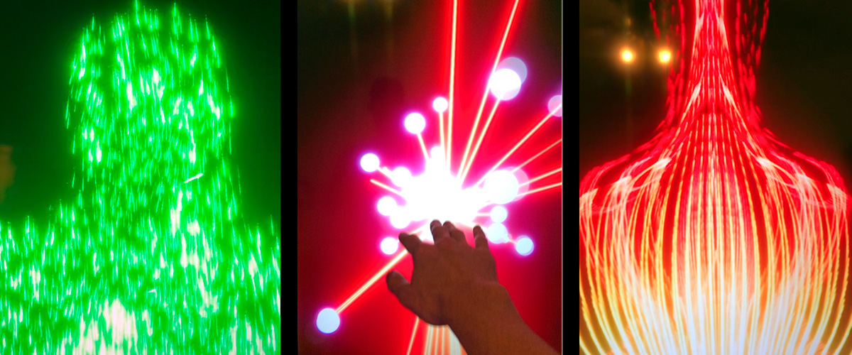 For controllers, this time it uses a midi fighter for the fun arcade buttons, a Leap Motion hand tracker to capture motion of the user, and a 3d camera to take a 3d capture of the user’s shape converting it into a 3d object where every point of the object gets used as an emitter for particles, and of course audio input so all parts of audio reactive.